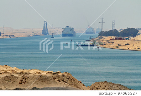 スエズ運河の復路を等間隔で進む貨物船