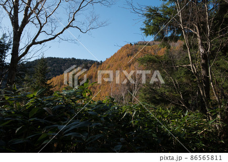 長野阿智村と岐阜中津川の間にある紅葉の時期の日本百名山の恵那山の広河原ルートの紅葉