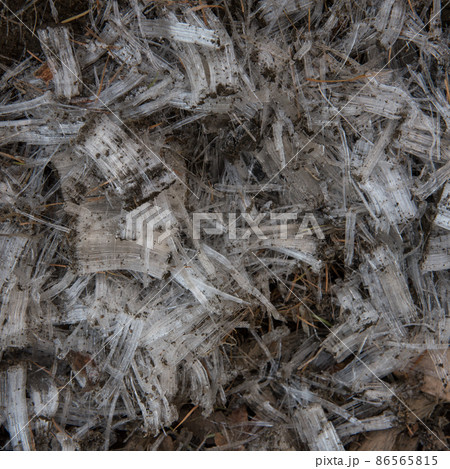 長野阿智村と岐阜中津川の間にある紅葉の時期の日本百名山の恵那山の広河原ルートの落ち葉と霜