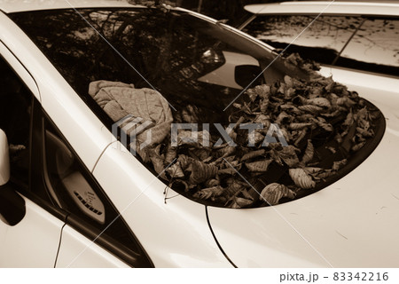 長野阿智村と岐阜中津川の間にある紅葉の時期の日本百名山の恵那山の落ち葉と車