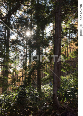 長野阿智村と岐阜中津川の間にある紅葉の時期の日本百名山の恵那山の広河原ルートの太陽
