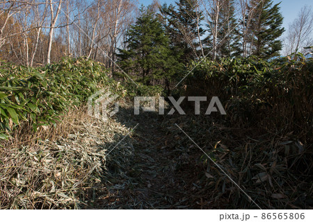 長野阿智村と岐阜中津川の間にある紅葉の時期の日本百名山の恵那山の広河原ルートの笹