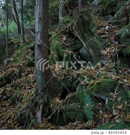 長野阿智村と岐阜中津川の間にある紅葉の時期の日本百名山の恵那山の広河原ルートの落ち葉と幹