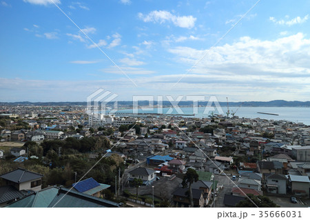 千葉県館山市館山の城山公園の展望台から北側(渚の駅たてやま,館山夕日桟橋など)を見る