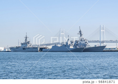 横浜ベイブリッジを背に停泊するイージス護衛艦「あたご」多機能護衛艦「もがみ」輸送艦「くにさき」