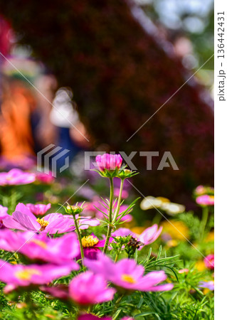 Close up of Garden Cosmos in the garden with sunlight. Pink and red garden cosmos flowers blooming Background. Nature and flower background. Flower and plant.
