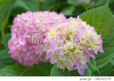 緑の葉と青く色づきかけた手毬型紫陽花をアップで撮影した風景