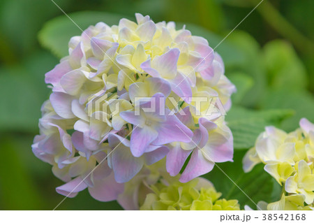 緑の葉と薄ピンクに色づきかけた手鞠型紫陽花の花にナミアゲハがとまっている風景