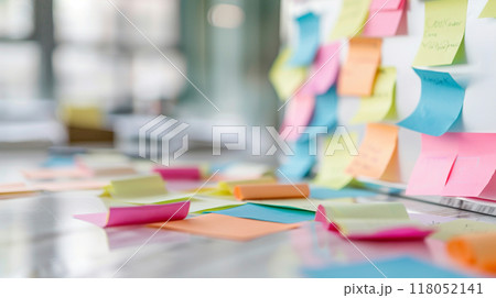 Colorful sticky notes with smiles covering an office wall, representing creativity, organization, and positivity