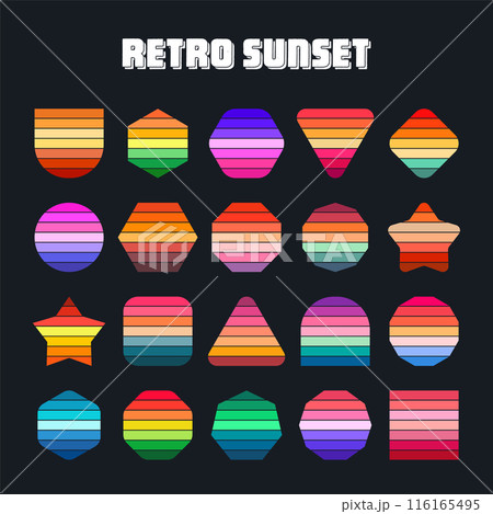 Vintage sunset collection. Various colorful striped sunrise badges in 80s and 90s style. Sun and ocean view, summer vibes, surfing. Design element for print, logo or t-shirt. Vector illustration