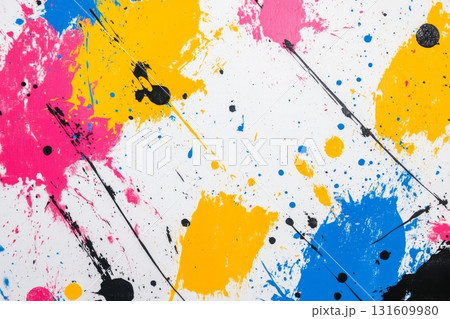 Colorful brush strokes in pink, blue, yellow, and black on a white background create an energetic abstract artwork that captivates the viewer