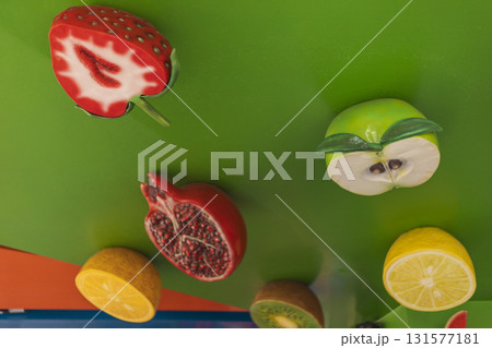 Various fruit shapes are presented on a bright green surface in a market. The display includes strawberries, apples, lemons, and pomegranates, creating a lively atmosphere