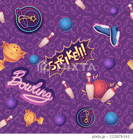 Bowling pattern skittles trophy cup and colored balls vector seamless background