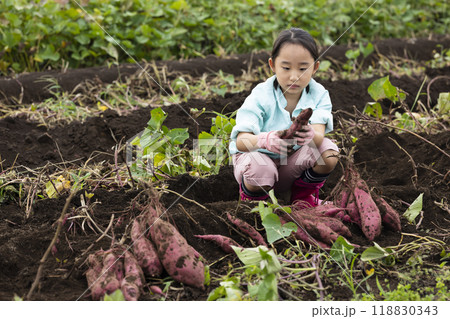 さつまいもを収穫する女の子