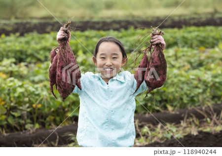 サツマイモを収穫するかわいい女の子