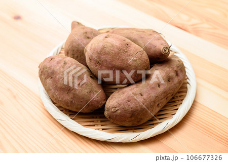 明るめ木目テーブルの上のザルに盛られた安納芋 サツマイモ