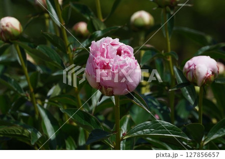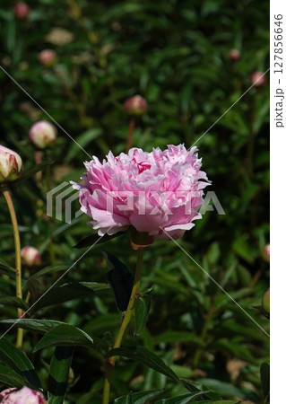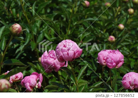 芍薬園にピンク色のシャクヤク(サラ・ベルナール)がたくさんのつぼみの中に咲いています。