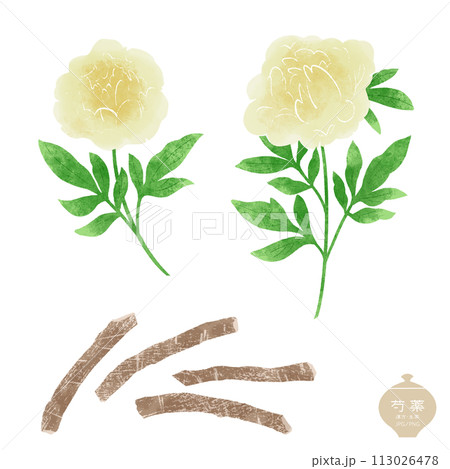 生薬のイラスト/ 赤い芍薬の花・根茎