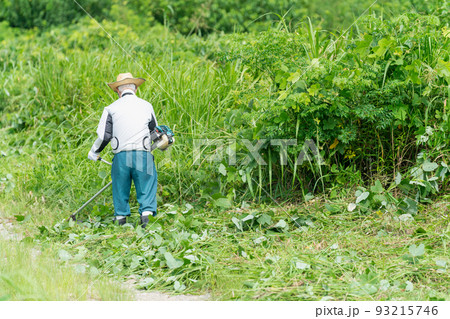 草刈機で草刈りをする高齢者 農作業 農業 おじいさん おばあさん 農家 栽培