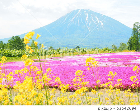 北海道の風景 羊蹄山と菜の花と芝桜庭園