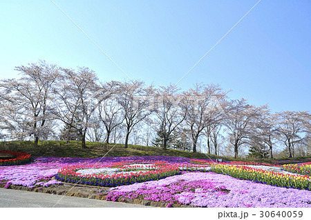 鮮やかに咲いたチューリップと芝桜 国営みちのく杜の湖畔公園 宮城県川崎町