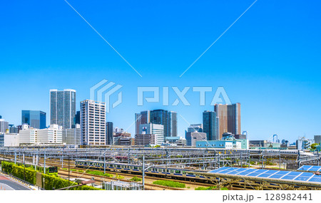 日本の東京都市景観新幹線や山手線(内外)、芝浦アイランドケープタワーなどタワーマンション群を望む