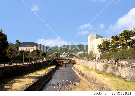 芦屋川を西側からルナホールを見る