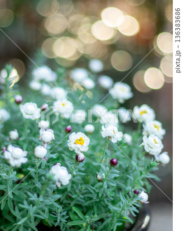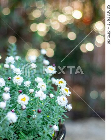 キラキラのイルミネーションの中、可愛く咲く白い花かんざし。