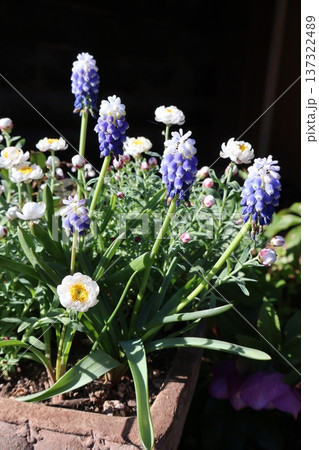 バイカラーのムスカリと花かんざしの寄せ植え