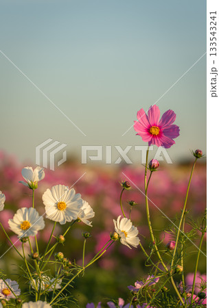 埼玉県鴻巣市のコスモス畑、夕焼け前の青空とピンクの秋桜