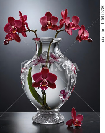 dark red orchids in a clear glass vase
