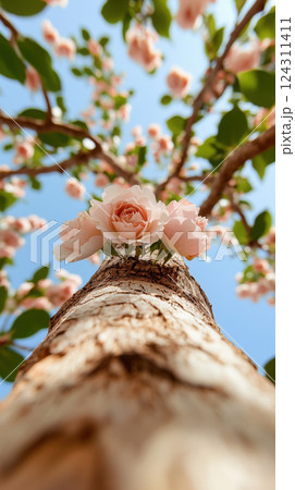 tall tree with lush branches and blooming pink roses under bright blue sky