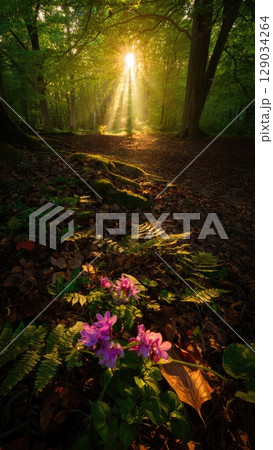 Peaceful sunbeam shining through forest onto blooming ground flora. Natural harmony and light. Smartphone nature background. Generative AI.
