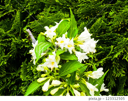 Flowering brunch of Weigela in late spring