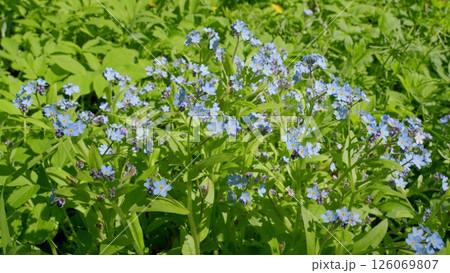 Delicate Blue Flowers Nestled Amidst Lush Greenery, Showcasing Natures Artistic Beauty and Serenity