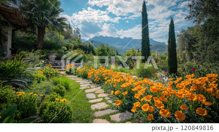 Picturesque garden with vibrant flowers and mountain view under blue sky