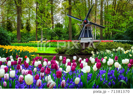 Dutch windmill and colorful fresh tulips in Keukenhof park, Netherlands