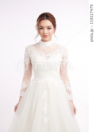Beautiful young asian woman in wedding dress on white background,