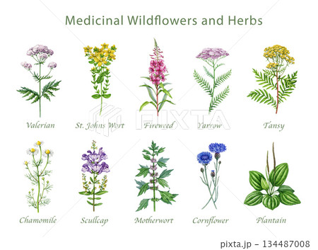 Medicinal wildflowers and herbs with names hand drawn watercolor illustration set. Blooming yarrow, motherwort, plantain, cornflower, chamomile, arnica wild plant elements on white background