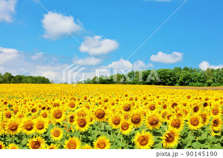青空とひまわり畑の爽やかな夏の北海道の風景