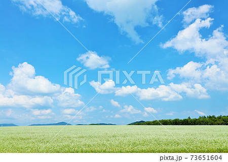 福島県南会津郡下郷町沢田 猿楽台地の広大なそば畑の白い蕎麦の花と青空と雲