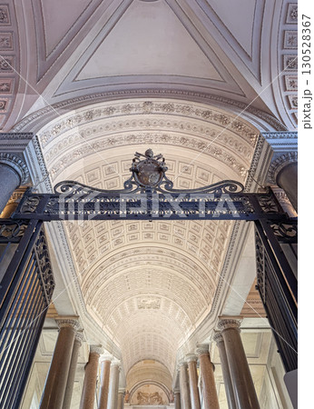 VATICAN CITY, ROME, ITALY - AUGUST 02, 2025 low-angle shot of the magnificently ornate ceiling of a grand hall within the Vatican Museums. The intricate decorations are framed by the huge iron gate