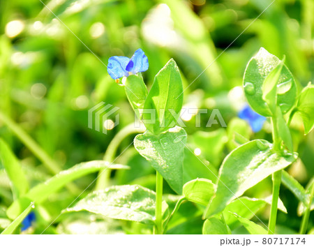 朝の光に輝く紫露草 陽光の中で咲く紫露草 朝露纏う紫露草