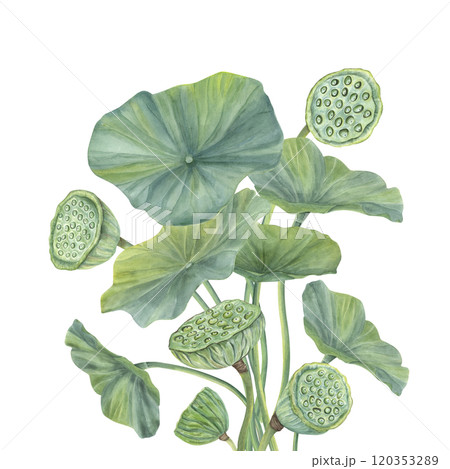 Watercolor lotus leaves with flower pods bouquet in realistic style. Hand drawn green water lily foliage, seed heads illustration for wedding invitation, ayurveda products, spa center.