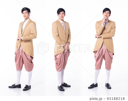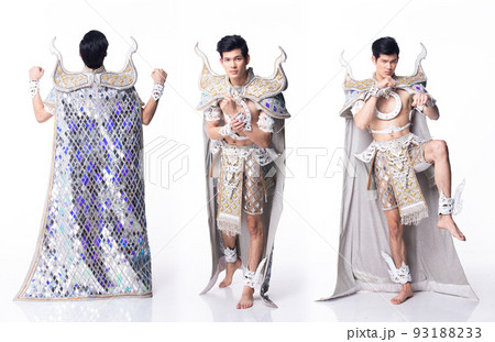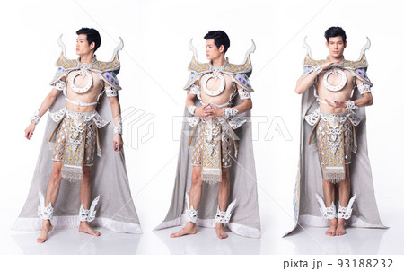 Beautiful Asian man wear Thai Traditional Costume as Thailand National dance performance Wedding Dress with gold decorative Fashion Items, white isolated, full length body