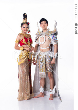 Collage Group full length Figure couple of 20s Asian man woman lover wear Thai traditional costume for wedding ceremony. Wedding male female stands and pose confident over white Background isolated