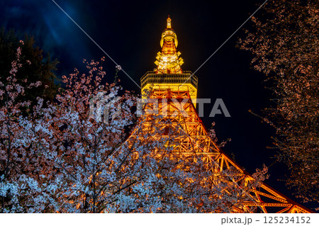 「東京タワー」満開の夜桜と東京タワーの風景