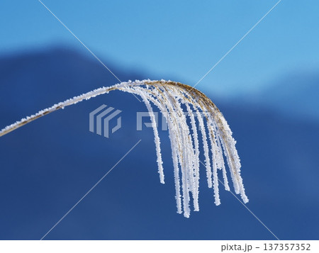千曲川の雪原に佇む霧氷のススキ