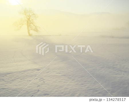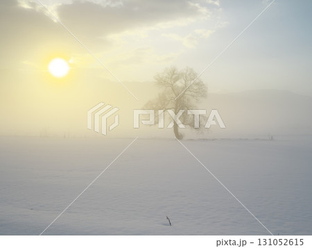 朝焼けの朝霧立ち込める千曲川の雪原に佇む一本の樹