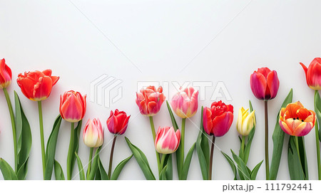 Spring tulips composition with text Hello Spring, seasonal postcard background, AI generated